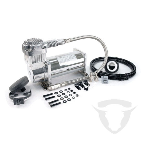 380C is a truly-rated continuous duty, 12-volt, 200 PSI compressor. It is capable of filling a 5.0-gallon tank from 165 PSI to 200 PSI in 3 1/2 minutes consistently, while never pulling more than 23 amps of power (@ 13.8 volts). Features include a standard 1/4” stainless steel braided leader hose with 1/4” NPT inline check valve and insulated wiring.